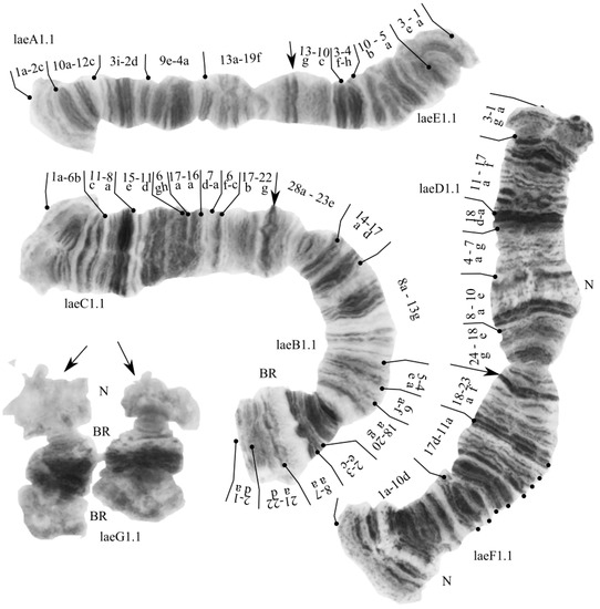 We performed a preliminary analysis of the banding sequences of Ch. laetus and found their similarity with the already known sequences of the primitive Chironomus riihimakiensis group. The most conservative banding sequences in Chironomus are located in arms E and F [31,44], and this species is no exception. The laeE1 banding sequence is very similar to most species from the cytocomplexes «thummi» and «pseudothummi», including Le1E1, Al1E1, and pluE1. The laeF1 banding sequence is very similar to sorF1, abeF1, and borF1; note that the part of the sequence “17d-11a 18a-23f” excluding the telomere region, is characteristic of most of the species Chironomus [43]. The banding sequence laeA1 is very similar to Le1A1, Al1A1, and a few species from the cytocomplexes “thummi” and “pseudothummi”. The sequences in arm B are more species-specific [45]. With reference to laeB1, only with the Al1B2 sequence we did find a high degree of similarity. The banding sequence laeC1 is very similar to Al1C1, pilC1, sorC2, and abeC1. The banding sequence laeD1 is similar to Tu1D2.