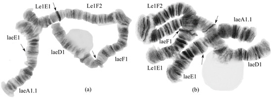 Chromosome arms of a Ch. sp. Le1 × Ch. laetus hybrid from the Yamal Peninsula, Russia. Arrows indicate centromeric bands; laeA1, Le1E1, etc., genotypic combinations of banding sequences in chromosome arms. (a,b): Chromosome arms of a Ch. sp. Le1 × Ch. laetus hybrid from the Yamal Peninsula, Russia.