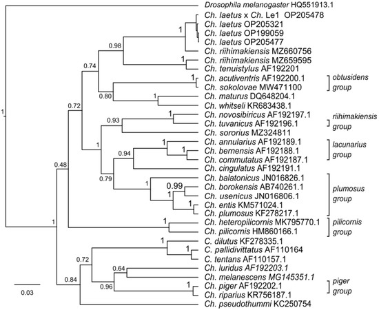 As previously shown, the studied species are members of the Ch. riihimakiensis group, and two COI gene sequences from Ch. riihimakiensis, MZ660756 and MZ659595, were found in GenBank; they were sampled in Finland, at the same locality (60°23′52.8″ N and 23°05′56.4″ E). The genetic distance between the sequences of Ch. riihimakiensis (MZ660756) and Ch. laetus was 2.5%, and the Ch. laetus × Ch. sp. Le1 hybrid was 2.3%. The genetic distance between sequences of Ch. riihimakiensis MZ660756 and MZ659595 was 12.4%, which is more than the accepted threshold of 3% [12,13,14,15,16]. The interesting point is that the distance between the sequences of Ch. laetus and species from the other members of the Ch. riihimakiensis group, Ch. novosibiricus and Ch. tuvanicus, is about 14%. One of the sequences of Ch. riihimakiensis (MZ659595) has a high degree of similarity with the sequence of Ch. tenuistylus (AF192201), approximately 3.1%.