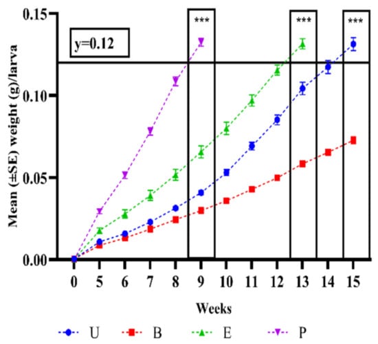 Average body weight (g) of individual Tenebrio molitor larvae in the four probiotic treatment groups during the experimental period of 15 weeks. Horizontal reference line at Y = 0.12 g indicates the threshold weight of the larvae to harvest. Blue: control (C); red: Bacillus subtilis (B); green: Enterococcus faecium (E); and violet: Pediococcus pentosacceus (P). Each treatment group consisted of 10 subgroups, each with 100 larvae. Larvae were harvested at three time points: P larvae at week 9, E larvae at week 13, and C larvae at week 15, as indicated by final data points. The bars in each curve represent the standard error (±SE) from the mean weight. Significant differences (p < 0.0001) in larval weight at weeks 9, 13, and 15 are indicated by ***.