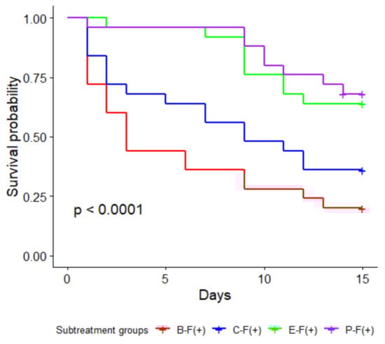 Kaplan–Meier curve showing the proportion of alive Tenebrio molitor larvae recorded over two weeks in four probiotic treatment groups. Blue: control (C); red: Bacillus subtilis (B); green: Enterococcus faecium (E); and violet: Pediococcus pentosacceus (P). Larvae were exposed to the fungus Metarhizium brunneum strain KVL 12–37 and observed for 14 days as a part of the fungal pathogen challenge experiment. Highest mortality was observed for fungus-treated larvae fed with B. subtilis bacterium, which was significantly different from the two probiotic treatment groups but not from the control group. The least mortality was observed for larvae supplemented with P. pentosacceus strains, which was significantly different from B. subtilis treatment groups but not from E. faecium and control groups. Different letters at the right end of the curves indicate significant differences (p < 0.05, Bonferroni adjustment for multiple comparisons) between the corresponding treatment groups.