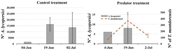 Number of A. lycopersici and number of predators per plant in the control and in the predator treatment. Scores were obtained via three destructive plant-washing samplings; the density of the collected mites was measured using a stereomicroscope (25×).
