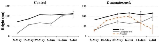 Height of the plant, maximum height at which collapsed trichomes were found, and maximum height at which T. montdorensis was found on each sampling date for the control and predator treatment.