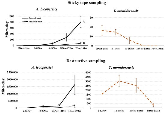 Densities of TRM and T. montdorensis (mite-days) per four leaves in the experiment with cages, autumn 2018. Counts were made using sticky tape or destructively by washing four leaves; the density of the collected mites was measured using a stereomicroscope (25×). Significant differences between treatments are indicated by capital letters (p < 0.05).