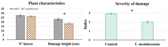 At the end of the test, the plants in the two treatments had similar numbers of leaves (t = −1.02; df = 6; p = 0.347), but the maximum height of collapsed trichomes was higher in the control than in the T. montdorensis treatment (t = −3.06; df = 6; p = 0.022) (Figure 4). The severity damage index was also significantly higher in the control than in the T. montdorensis treatment (Figure 4) (t = −5.74; df = 6; p = 0.001).