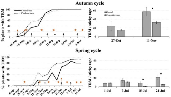 Percentage of plants with TRM and A. lycopersici density, measured using sticky tapes in two greenhouse tomato crop cycles, autumn 2020 and spring 2021. Arrows indicate the phytosanitary treatments against A. lycopersici that were used in each plot (black for the control and yellow for the predator treatment); yellow asterisks indicate predator releases. Black asterisks indicate significant differences between treatments (p < 0.05).