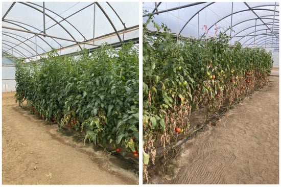 This mite damages tomatoes by feeding on the epidermal cells of the leaves and the stems, causing a reduction in photosynthesis in the damaged tissue [4,5]. In greenhouse conditions, due to its exponential growth, the mite can dry up to 79% of the leaves and kill the plant [6]. Depending on the infestation level, yields may be reduced by 25% to 100% [7]. With large infestations, russeting may occur in young fruit, reducing the crop’s commercial value [8].