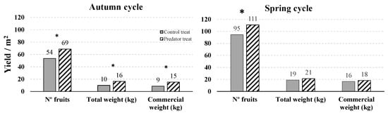 Number of fruits, total fruit weight, and weight of commercial fruits in the two treatment plots for the two crop cycles performed. Black asterisks indicate significant differences.