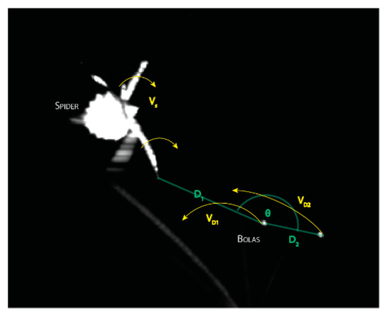 C. akermani performs its capture technique without the direct presence of prey [21,27]. This allowed us to observe the creation and spinning of many bolas (N = 7) over only a few nights. From the videos, the movements of the spider and glue droplet were manually tracked using the open-source kinematics software Kinovea [28] (Figure 1). Up to four positions were tracked: (SA) the tip of the leg the spider uses to spin itself, (AA) the anchoring leg the spider holds the bolas with, and up to two glue droplets (D1, D2) located on the bolas. Each position was tracked during the entirety of each video which varied between 4 and 20 rotations in length. The position was tracked as a radial vector from a coordinate system located below the spider, perpendicular to the center of the spider. Rotational velocities were calculated using the finite difference in position and the known time interval between frames, measured as peak displacement using the measured diameter of rotation for that particular revolution. For videos in which the bolas were made of two droplets, we also measured the angle formed by the middle droplet, the end of the bolas, and the spider’s anchoring leg using the law of cosines (Figure 1). For all values, averages and standard errors were calculated. A mixed ANOVA was run to determine if the four tracked locations varied statistically in their rotational period, velocity, and diameter. Radial distances were plotted and used to find the phase difference between the spider’s legs and glue droplet maximum displacement.
