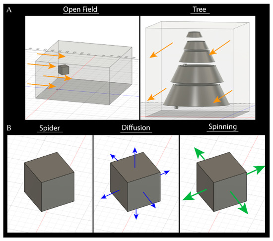 Environment models and flow conditions used in computational fluid dynamics modeling. (A) Open field tests involved a rectangular environment open on all sides except the bottom. Orange arrows show the direction of the wind, behind the spider, at 3 m/s. The tree model was made of five rings, and two spiders were placed due to being a larger structure, one at the top and one at boom. (B) The spider and pheromone cloud were modeled as a perfect cube, with sides of length 1 cm. The diffusion condition applied a small velocity, 0.05 m/s, exiting all faces of the cube. The spinning condition applied a larger velocity, 3 m/s, exiting the four front and back faces of the spider.