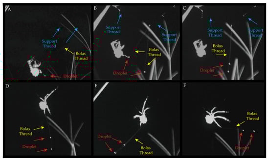 Breakdown of Multi-Bolas Creation and Prey Capture Behavior. The spider shown has a carapace width of 12 mm. Red arrows in each image are glue droplets and yellow arrows show the bolas capture thread. C. akermani sits on its grass or leaf until sundown. Like other spiders it first moves up and along the top of its leaf or grass stalk, creating a simple beam. It then waves its long legs in the air, wafting them about. (A) the spider creates two support threads (blue arrows), sliding down one and attaching a bolas to one strand. It lets the droplet slowly fall away as it gets larger. (B,C) then moves back up to the top anchoring another thread to the support beam. It drops back down again, but not as far as previous, and creates another glue droplet, which is allowed to swing into the other strand, making a single overall structure. (D) Once finished, the spider orients itself parallel to the support bar, grabs the bolas with its lower second leg, and holds its especially long and hairy front legs out. (E) It spins the bolas in a circle with its anchoring second leg. (F) after it has a consistent and circular motion started with the droplets, the spider begins to swing its front legs back and forth, spinning/bouncing.
