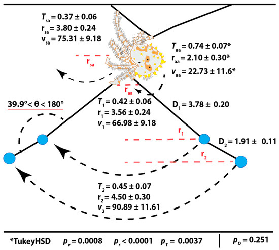 Throughout our seven recorded videos, all measured values (period T, velocity v, and radius r) were highly variable for both the spider and bolas glue droplets (Figure 4). Post hoc Tukey analysis showed the anchoring leg (AA) was always statistically lower in all values than that of the swing leg (SA) of the spider and the glue droplets. Within each video, the maximum rotation of D2 was always greater than D1, 1.28 ± 0.13 times. The velocity similarly was always 1.37 ± 0.11 times higher, while the period was the same at 1 ± 0.21 s. D2 had the overall largest values with a maximum rotational diameter of 11.52 cm, and spinning upwards of 150.09 cm/s. The angle formed by D1, D2, and AA showed a variation between the 180° of a straight line and 39.9°.