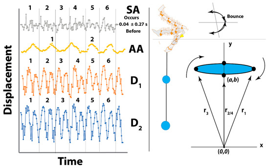 Leg and Glue Droplet Rotational Phase Alignment. Because all distances were measured as vectors radiating from a common origin, rotational periods are shown as two maxima, as the maximum displacement occurs twice. The second rotation or the second half of the circle is always shorter and slower, meaning that the energy the spider is putting into the thread is falling off almost instantly. Thus, two peaks show the period, and the rotational diameter is the maximum displacement of both peaks combined. Calculating the frames between distances, we found that the displacement of droplet two (D2) was always higher than droplet one (D1) but D1, D2, and the swing leg (SA) were nearly perfectly in sync. The maximum displacement of the SA always occurred two frames or 0.04 s before the droplets, meaning it was using its body to accelerate the glue droplets. The SA does not have two peaks because the spider is not completing a full rotation, but instead is thrusting forward and bouncing back. The period of the anchor leg (AA) was always twice as long as the other periods.