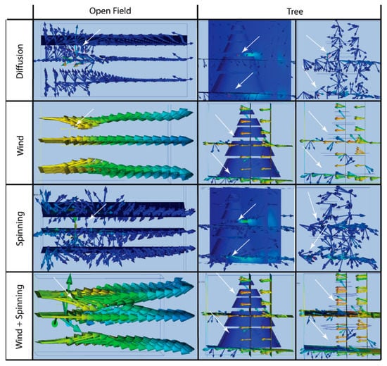 Pheromone Airflow—velocity field results of open field and tree conditions. Each image shows the Autodesk CFD velocity vector results. Air velocities are coded by a color gradient where blue is slower, and red is faster (colors are relative within each test). White arrows show the location of the spider in each test, one in the field and two in the tree. The tree tests are shown with the full tree structure and with only an outline of the tree to view airflow within the tree more easily. Open field conditions—The open field shows how diffusion creates minimal velocity around the spider. The spinning creates a larger velocity but mostly creates turbulence around the spider which continues further downstream. The wind has the largest effect on airflow. It slows down slightly as it passes through the nearly stagnant pheromone cloud, but the stream remains laminar and independent. When spinning is added to the wind, the velocity in front of the spider is increased. The normally straight trail of pheromones is instead mixed up and down being carried by the wind in now multiple directions, further distributing the pheromones over the open landscape. Tree conditions—The various barriers and openings within the tree innately create pockets of higher and lower-density air as the wind blows past it. The wind is pulled through the tree, swirling around, before being pulled out the opposite side. The highest flow velocities are surrounding the tree and exiting the tree downwind. The structure of a tree allows pheromones to be distributed throughout a tree more easily and naturally. Pheromones fill the tree and then leak from it, creating a beacon. The velocities within the tree fall when the spider bounces, slowing down the air flow in the tree.