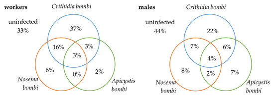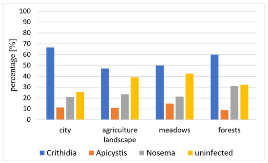 - Goulson, D.; Whitehorn, P.; Fowley, M. Influence of urbanisation on the prevalence of protozoan parasites of bumblebees. Ecol. Entomol. 2012, 37, 83–89. [Google Scholar] [CrossRef]