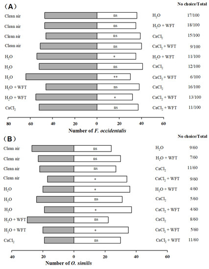 Olfactory responses of F. occidentalis (A) and O. similis (B) to volatiles from five test sources. Asterisks indicate significant differences based on χ2 test (** p < 0.01, * p < 0.05). “ns” represents no significant difference (p > 0.05).
