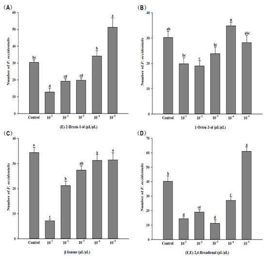 In the six-arm olfactory test, (E)-2-hexen-1-ol (F = 21.268, p < 0.01), 1-octen-3-ol (F = 6.744, p < 0.01), β-lonone (F = 24.265, p < 0.01), and (E,E)-2,4-hexadienal (F = 49.488, p < 0.01) showed significant effects on the behavior of F. occidentalis at six concentrations. The 10−1 μL/μL concentration of (E)-2-hexen-1-ol had the greatest repellent effect on F. occidentalis, while the 10−5 μL/μL concentration was attractive to thrips. A significant repellent effect on F. occidentalis was observed for 1-octen-3-ol at a concentration of 10−2 μL/μL. 10−1 and 10−2 μL/μL β-lonone had significant repellent effect. A significant repellent effect of (E,E)-2,4-hexadienal was observed at concentration of 10−1 to 10−4 μL/μL, while an attractive effect was observed at the concentration of 10−5 μL/μL (Figure 3).
