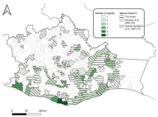 This study demonstrated that Chagas disease is still of paramount importance in Oaxaca. In our entomological surveys, we found that Triatoma spp. nymphs, which are difficult to identify morphologically, could be identified by DNA barcoding, similar to what has been utilized for the molecular identification of immature Culicoides biting midges [34]. Past entomological surveys of the four primary domestic triatomines of this region, T. dimidiata, T. mazzotti, T. pallidipennis, and T. phyllosoma, in 1980 documented their occurrence in 24 municipalities [17]; however, Ramsey et al. (2000) [12] conducted a study between 1996–1998 and reported eight species of triatomines in 64 municipalities [12]. The current study also documents records of the four primary domestic triatomines in 60 municipalities (Figure 1). Figure 1 depicts exactly the 32 new municipality records of this study, revealing, in terms of vector, species occurrence, while Figure 2 shows the actual presence of Triatoma barberi, T. dimidiata, T. mazzotti, and T. phyllosoma. We also highlighted the historic distribution records of the four predominant domestic species of triatomine (Figure S1–S4) and of other triatomine species (Figure S5) [12,17].