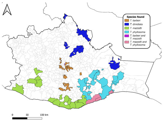 Actual distribution of the four predominant domestic species of Triatominae in the state of Oaxaca, México: Triatoma barberi, T. dimidiata, T. mazzotti, and T. phyllosoma (including T. phyllosoma picturata).