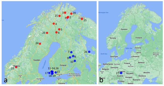 Sampling sites of C. ledi in (a) Fennoscandia and (b) Czech Republic. Numbers correspond to the numbers of locations presented in Table 1. Red dots: genuine parthenogenetic populations and bisexual populations carrying haplotype H1. Blue dots: populations where diploid females and males carrying haplotype H2 reproduce bisexually.