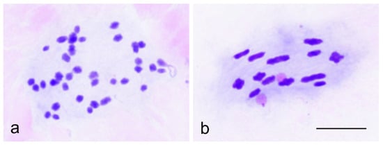 Before performing the haplotype study, we determined the ploidy level of the females. For this, we analyzed metaphase I (MI), which, as we showed previously [], can be found in mature eggs taken from females collected in mid-August or later. Similarly, males were first analyzed cytologically to find out if meiosis was normal or aberrant [,,]. Male meiosis can be studied throughout the season as long as the males are available. Alcohol-preserved females and males were dissected, and the abdomen was immersed overnight in a 3:1 (ethanol: acetic acid) fixative for cytological analysis, while the head and thorax were preserved in alcohol for subsequent molecular analysis of the same individual. After overnight fixation, the abdomen was transferred to a drop of 45% acetic acid on a microscopic slide, and 4–5 mature eggs were extracted from the females and cut into halves using sharpened tungsten needles. When the yolk became transparent, an 18 × 18 mm coverslip was laid on top of the material. After squashing, the slide was left at room temperature for 4–5 min before transferring onto dry ice. Following the removal of the coverslip, the slides were dehydrated in fresh 3:1 fixative for 30 min and air-dried. The slides were stored in a dust-free place and subsequently stained first in Schiff’s reagent for 20–25 min after 6 min of the hydrolysis stage, followed by 5% Giemsa staining for 30 min. For analyzing the male meiosis, testes were dissected and cut into pieces in 45% acetic acid, and the procedure was continued as with the female slides, except that the staining with Schiff´s reagent was for 10–15 min and staining with 3% Giemsa was for 20 min.