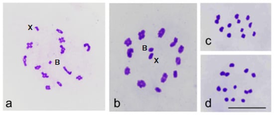 In male meiosis, prophase I showed 12 bivalents, the X chromosome, and commonly one B chromosome (Figure 3a). Metaphase I showed 12 bivalents and a univalent X chromosome, or if a B chromosome was present, it was located along with the X in the center of a radial metaphase plate (Figure 3b). At metaphase II, either 12 (Figure 3c) or 12 + X chromosomes were observed when there was no B chromosome. (Figure 3d).