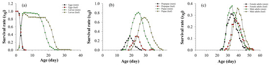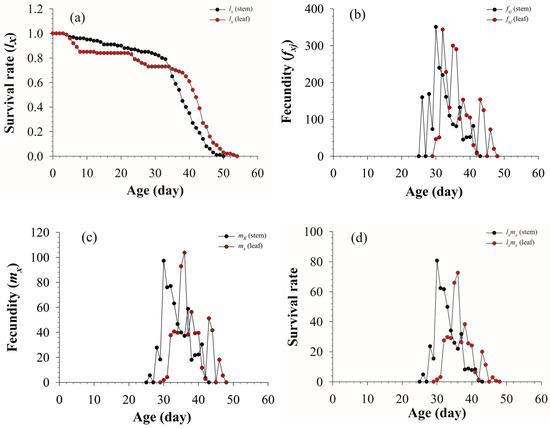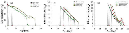 Figure 3 shows that the age-stage-specific life expectancy (exj) recorded under all of the treatments decreased with time. Two tissues did not affect pupal, prepupal, female, and male life expectancy; the life expectancy of larvae fed on stems was lower than that of larvae fed on leaves.