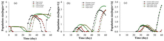 The population growth and stage structure of S. litura on asparagus stems and leaves with an initial population of 10 eggs for the next 60 days were projected by incorporating the age-stage, two-sex life table data into the TIMING-MSChart program (TIMING-MSChart is available at http://140.120.197.173/Ecology/prod02.htm, accessed on 13 November 2022) [51].