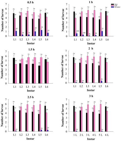 Feeding preference of each larvae stage of S. litura between asparagus stems and leaves. Values are mean ± SE, different lowercase letters at the same investigation time indicate that the same instar larvae are significantly different between different tissues, and different capital letters indicate that the different instar larvae are significantly different between the same tissues (p < 0.05).