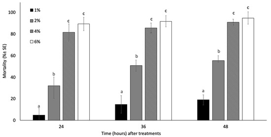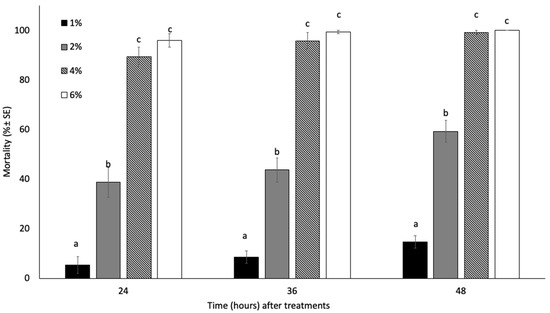 Mean percent mortality ± SE of A. gossypii adults exposed to different concentrations of Citrus sinensis EO nano-emulsion after 24, 36, and 48 h in laboratory trials. Different letters indicate statistical differences among the different treatments at the same exposure time (ANOVA, p < 0.05).