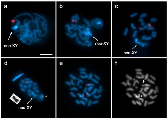 For the FISH and GISH techniques, spread chromosome preparations were made from the testes of adult males. Gonads were dissected in a physiological solution, swollen in a hypotonic solution (0.075 M KCl) for 10 min, and then fixed in freshly prepared Carnoy’s fixative (ethanol, chloroform, acetic acid; 6:3:1) for 15–30 min. Cells were dissociated with tungsten needles in a drop of 60% acetic acid and spread on the slide with a heating plate at 45 °C, as described previously []. Then the preparations were dehydrated in an ethanol series (70, 80, and 96%, 30 s each) and stored at −20 °C until further use.