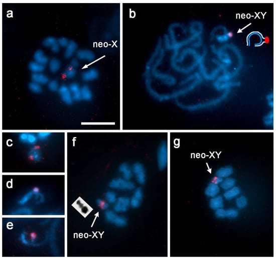 Rhionaeschna planaltica (2n = 16, n = 7 + neo-XY). Localization of rDNA by FISH with 18S rDNA probes (red signals) (a–g). Giemsa staining (inset in f). (a,c) Spermatogonial prometaphase; (b,d,e) pachytene; inset in (b): schematic drawing of the neo-XY bivalent (neo-X in white, neo-Y in blue, probe signals in red); (f) diakinesis, inset: neo-XY bivalent; (g) metaphase I; (c) shows a neo-X chromosome to illustrate the subterminal position of the signal; (d,e) show selected neo-XY bivalents from other cells. Bar = 10 µm.