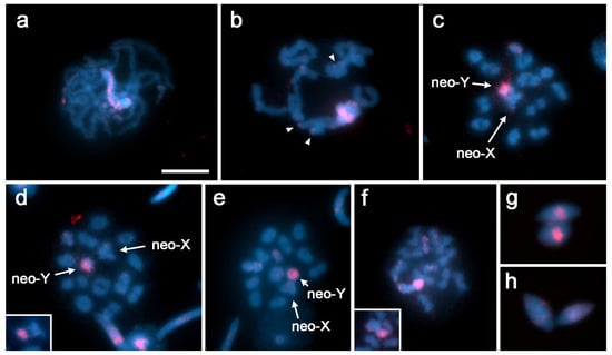 GISH was used to determine whether the morphological differentiation of neo-sex chromosomes in R. bonariensis is also accompanied by differentiation at the molecular level, i.e., in DNA composition. In the GISH experiment, a labeled genomic probe from R. bonariensis males was hybridized to meiotic chromosome preparations of the same species with an excess of unlabeled genomic DNA from R. bonariensis males. At the pachytene stage, the male probe highlighted one of the members of the sex chromosome bivalent over most of its length (Figure 3a). Weak hybridization signals were also detected in some telomeric regions of the autosomal bivalents (Figure 3b). From diakinesis onwards, the smaller chromosome of the sex chromosome bivalent (neo-Y) showed strong hybridization signals (Figure 3c–e). All prometaphase and metaphase II stages had the heteromorphic neo-XY bivalent, which showed strong hybridization signals on the neo-Y chromosome and occasionally a small signal in the terminal region of the neo-X chromosome (Figure 3f). Distinct hybridization signals were observed in approximately half of the spermatids and were absent in the other half (Figure 3g,h).