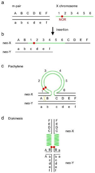 In the case of R. planaltica, a detailed analysis of meiotic prophase and results of FISH led us to postulate the origin of neo-XY sex chromosomes. The submedial loop observed at the pachytene stage corresponds to the X chromosome inserted into the m-chromosome at about one-third of its length (Figure 4a–c). In mitosis, the NOR is located in the subterminal region of the neo-X chromosome, whereas in pachytene it is located in the loop of the X chromosome. In diakinesis, the NOR is located near the chiasma, which always occurs in the terminal autosomal segment of the neo-X chromosome (Figure 4d). Based on this observation, we propose that NOR is located in the subterminal region of the original X chromosome, which is connected to the smaller part of the original m-chromosome, and that the single chiasma in the bivalent occurs in this small segment. So far, the hypothesis that the neo-X chromosome originates as a result of transposition (insertion) has only been proposed for R. planaltica (this study) and the dragonfly Orthemis ambinigra [].