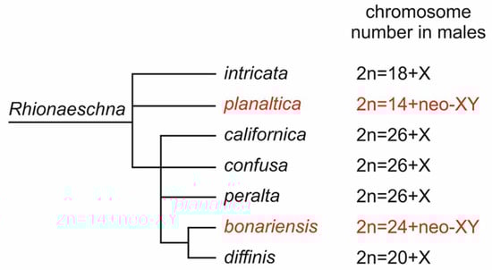 The phylogenetic relationships of Rhionaeschna allow the species to be grouped into four clusters. R. intricata belongs to one cluster, R. planaltica to the second cluster, and the species from R. californica to R. diffinis to the third cluster [] (Figure 5). In the fourth cluster, there are no species with a known karyotype. According to these phylogenetic relationships, R. planaltica and R. bonariensis are not closely related. In addition, the origins of their neo-XY system differ, with the system evolving by transposition in the former (insertion of the X chromosome into an m-chromosome) and by terminal fusion of an autosome with the X chromosome in the latter. Thus, it can be concluded that the neo-sex chromosomes of these two species evolved independently. Similarly, it can be concluded that the reductions in the number of autosomes observed in R. intricata and R. diffinis have independent origins (Figure 5).
