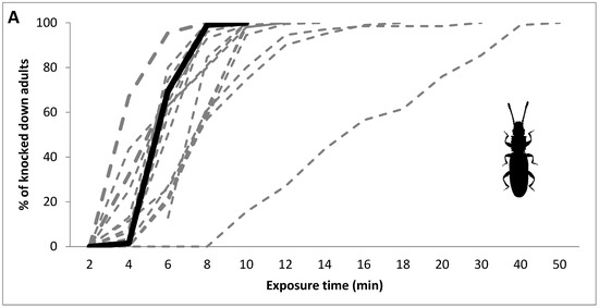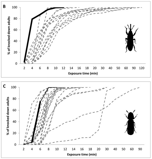 (A–C) Percentage of knocked down adults of different populations of the three tested species of stored-product pests (A—O. surinamensis; B—S. oryzae; C—R. dominica) after exposure to phosphine at 3000 ppm for different observation intervals (in minutes). The black, solid line shows the benchmark values for the laboratory population; the grey, dashed lines show the values for the field populations.