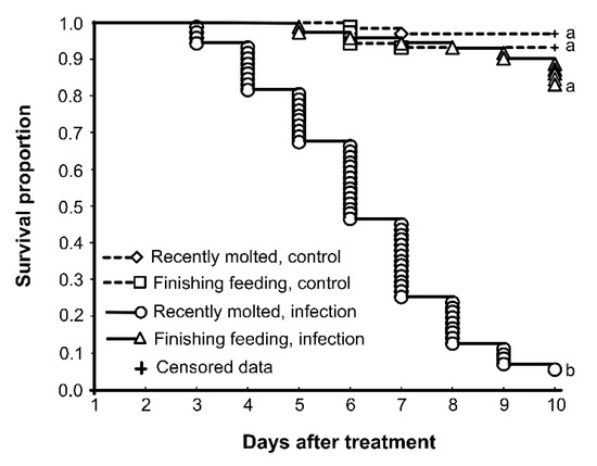 We repeated the survival assay in the present study, and the results were consistent with previous work [8]. The infection of recently molted larvae led to a significant decrease in survival, down to 5% over 10 days (Figure 1). Infection of finishing feeding larvae led to 85% survival over 10 days; this result did not significantly differ from controls, which showed 93–97% survival.