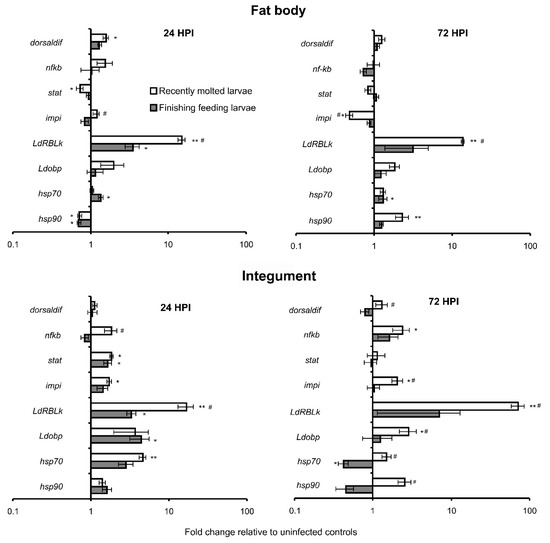 Hsp70 and hsp90 manifested complicated, not straightforward changes in expression, depending on larval stages, time after infection, tissue, and the genes. Hsp70 tended to be upregulated in the fat body in response to infection at both larval stages, but a significant increase was registered in finishing feeding larvae at 24 and 72 h (1.3–1.4-fold compared to control). In the integument, at 24 h after infection, the gene tended to be upregulated, and a significant increase was registered in recently molted larvae (4.6-fold relative to control). On the contrary, the gene was significantly downregulated at 72 h after infection in finishing feeding larvae (2.4-fold relative to control).