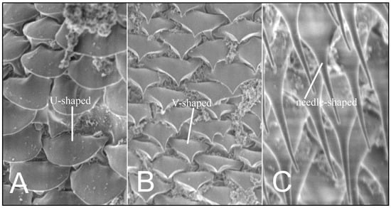 Using the scanning microscopy (SEM), three variants of ornamentation in the form of scales and setae shape are known to exist: smoothly-ended (U-shaped), sharp-ended (V-shaped), and needle-shaped setae (Figure 3).
