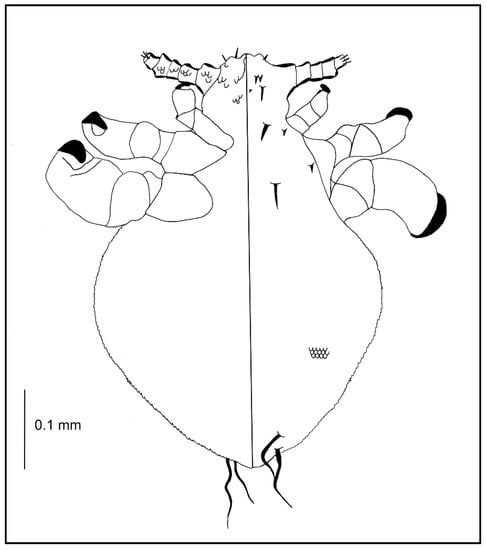 The morphology of H. affinis nymphs considerably differs from other European species (H. acanthopus—Holarctic parasite on voles, H. captiosa—cosmopolitan on M. musculus, H. edentula—Eurasia, H. longula—Eurasia) (Table 2). No morphological characters of H. edentula nymphs exists. The characteristic, heart-shaped body, is a feature that distinguishes the nymphs of H. affinis from the other three mentioned above. H. affinis has a heart-shaped, more or less broad, corrugated abdomen, while H. acanthopus, H. captiosa, and H. longula have an elongated, egg-shaped or barrel-shaped abdomen with poorly or without corrugation [,,].