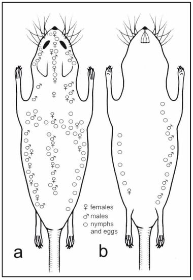 Topographic preferences of all life stages of Hoplopleura affinis on host body: (a) dorsal view; (b) ventral view.
