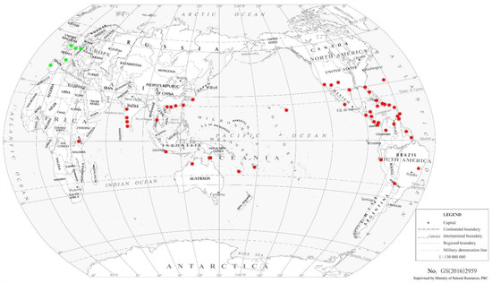 The native range is presumed to be Central America [10], although this species has been recorded subsequently in North and South America, Southeast Asia, Africa, Oceania, and Europe. F. vespiformis is distributed in different locations with references, as shown in Table 1, and distributed in wild and artificially released populations around the globe, as shown in Figure 1.