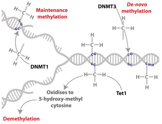 DNA methylation and demethylation. DNA can be reversibly modified by the addition of a methyl group on a cytosine residue. The addition of the methyl group to this residue is catalysed by DNA methyltransferases (DNMT3 catalyses de novo DNA methylation while DNMT1 has been characterised as a maintenance methyltransferase). DNA can be demethylated by the oxidation of the methylated cytosine to 5-hydroxy-methylcytosine, which is catalysed by the TET (ten-eleven-translocase) family of proteins.
