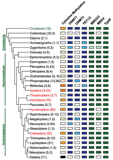 - Provataris, P.; Meusemann, K.; Niehuis, O.; Grath, S.; Misof, B. Signatures of DNA Methylation across Insects Suggest Reduced DNA Methylation Levels in Holometabola. Genome Biol. Evol. 2018, 10, 1185–1197. [Google Scholar] [CrossRef]