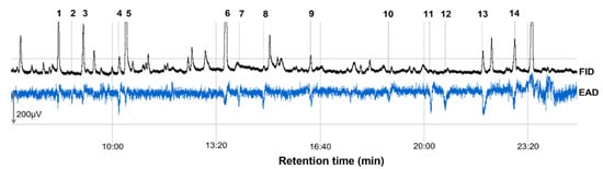 GC–EAD recordings revealed the presence of 14 active peaks in antennal responses of European cherry fruit fly females to volatile compounds released by sour cherry fruit (Figure 1). This indicated that female antenna is sensitive to 14 VOCs at least. Results of EAG-active compound identification by GC–MS alongside with their retention time and other characteristics are presented in Table 2.