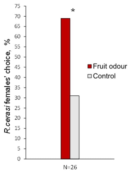 Rhagoletis cerasi females’ choice of cherry fruit odour versus control in Y-olfactometer. Asterisk marks a statistically significant difference (* p < 0.05).