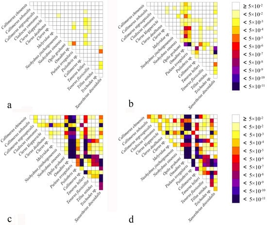 Heterogeneous sequence divergence of mitochondrial genomes of Cleridae resulting from pairwise comparison of four aligned datasets: (a) PCG12rRNA; (b) PCG; (c) PCGrRNA; (d) PCGRNA. The dark colors indicate the higher randomized accordance, whereas the lighter colors indicate the opposite. All taxa names are listed to the right of the heat map. Although cells specify p-values > 0.05, indicating that corresponding pairs of nucleotide sequences do not violate the assumption of global stationery and homogeneity conditions.