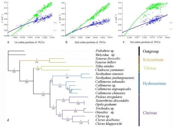 Nucleotide substitution saturation plots of all mitochondrial protein-coding genes: (a) 1st codon positions; (b) second codon positions; (c) third codon positions. Plots in blue and green indicate transition and transversion, respectively; (d) phylogenetic tree of Cleridae inferred from the BI and ML analyses of the PCG12RNAdataset. Numbers at the branches determine posterior probability (upper) or bootstrap value (lower).