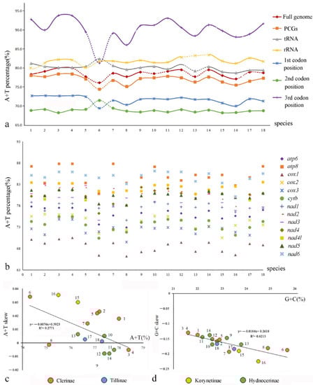 Comparison of nucleotide compositions of mitochondrial genomes among four subfamilies of Cleridae: (a) A+T% of different components or positions; (b) A+T% of different PCGs; (c) the correlations between A+T% and AT skew in the 13 PCGs; (d) the correlations between G+C% and GC skew in the 13 PCGs.