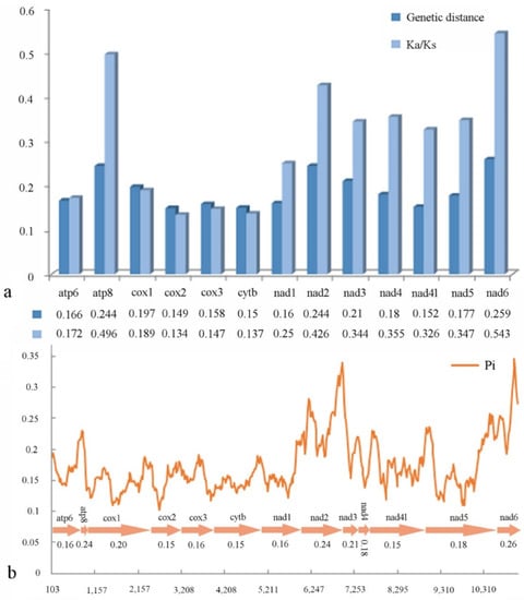 Sliding window analysis was implemented to study the nucleotide diversity of 13 PCGs exhibited in Figure 5b. Among the genes, nad6 (Pi = 0.26) has the highest variability, followed by atp8 and nad2 (both Pi = 0.24); cox2, cytb, and nad4l (all Pi = 0.15) have the lowest variability. This result is roughly congruent with that of the above pairwise genetic distance calculation.